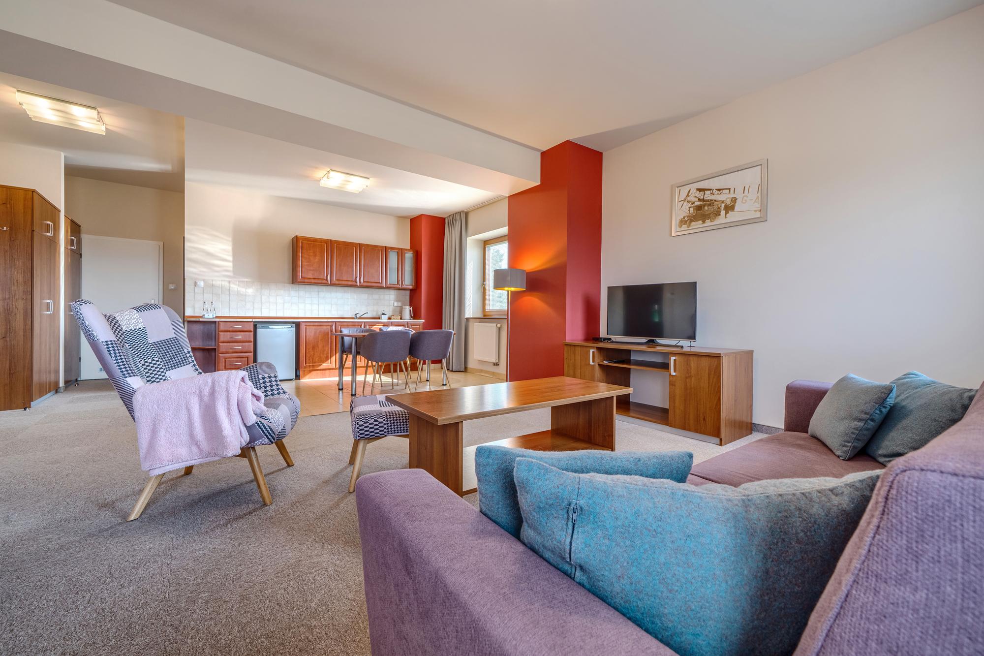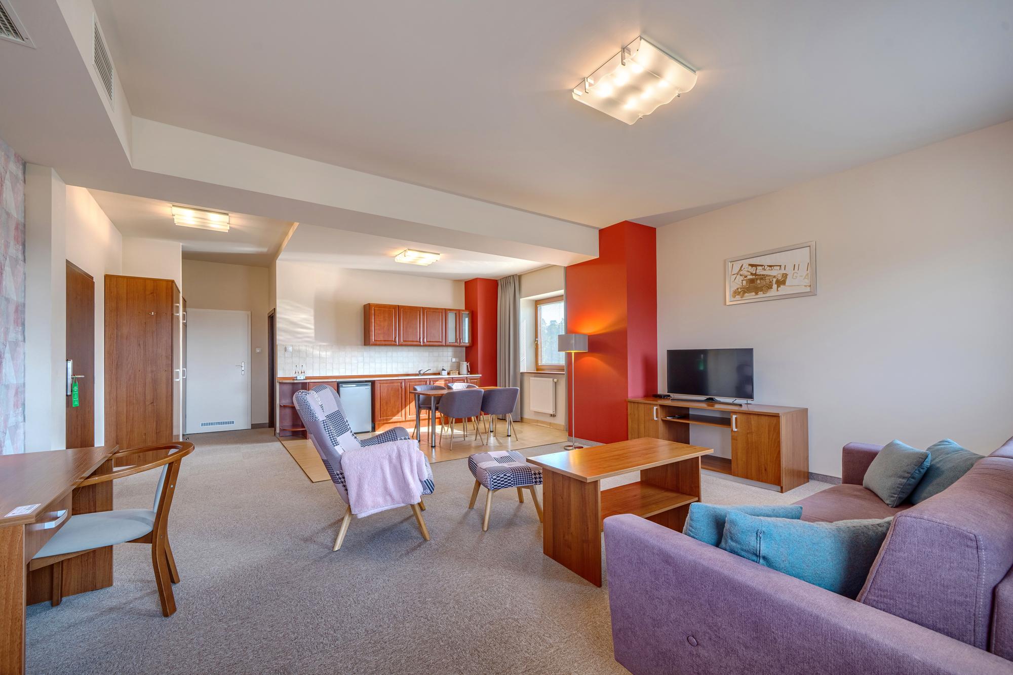 This spacious room consists of a living area with a kitchenette, a separate bedroom, and a bathroom with a bathtub and complimentary toiletries. The kitchenette includes a refrigerator. The air-conditioned room offers a seating area with an LCD TV, dining space, wardrobe, electric kettle, and sofa. It has one double bed.